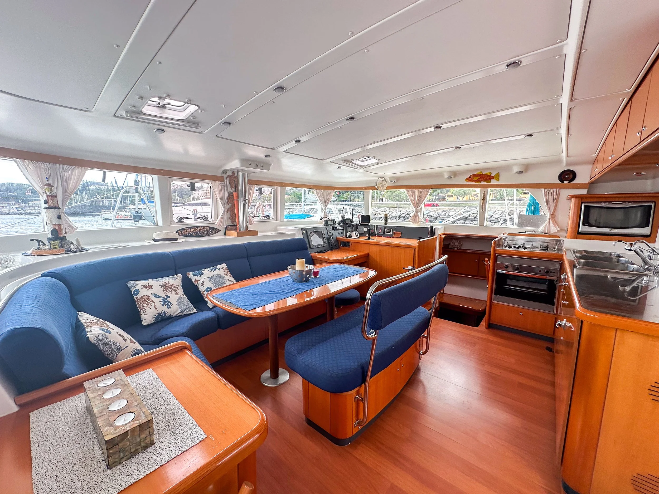 A bordo do Catamaran “Manuela”, desfrute de amplos espaços interiores pensados para o seu conforto, perfeitos para relaxar e aproveitar a viagem com total privacidade!
